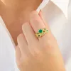 grøn ring i forgyldt messing med blank overflade og 2 glatte grønne aventuriner og 3 glatte grønne onykser og 4 glatte lyseblå krystaller.