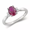 rød ring i 9 karat hvidguld med blank overflade og 1 facetslebne røde syntetiske rubiner og 4 facetslebne hvide zirkoner.