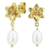 øreringe i forgyldt sølv med blank overflade og facetsleben hvid zirkon 2 hvide perler.