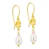 lyserød øreringe i forgyldt messing med blank overflade og 2 glatte rosa kvarts 2 hvide syntetiske perler.