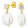 perle øreringe i forgyldt messing med mat overflade og 2 facetslebne hvide zirkoner 2 hvide perler.
