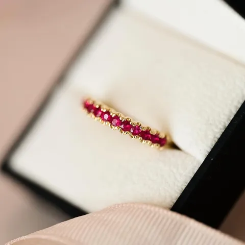 rubin alliancering i 14 karat guld med blank overflade og 13 facetslebne rubiner