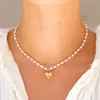 vandfast hjerte halskæde i forgyldt stål med blank overflade hvid syntetisk perle.